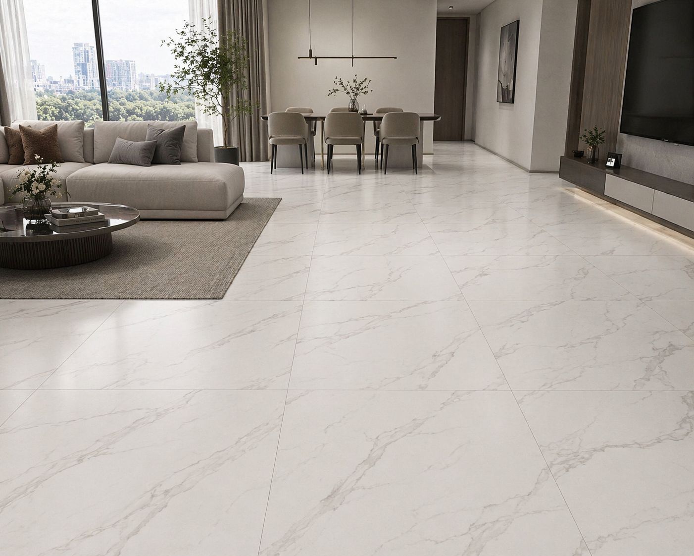 Está elegante cerámica de acabado tipo mármol destaca por su tono blanco suave con vetas grises sutiles, ideal para crear espacios modernos, luminosos y sofisticados. Su diseño inspirado en piedra natural aporta una estética limpia y atemporal, perfecta para interiores de alto nivel.