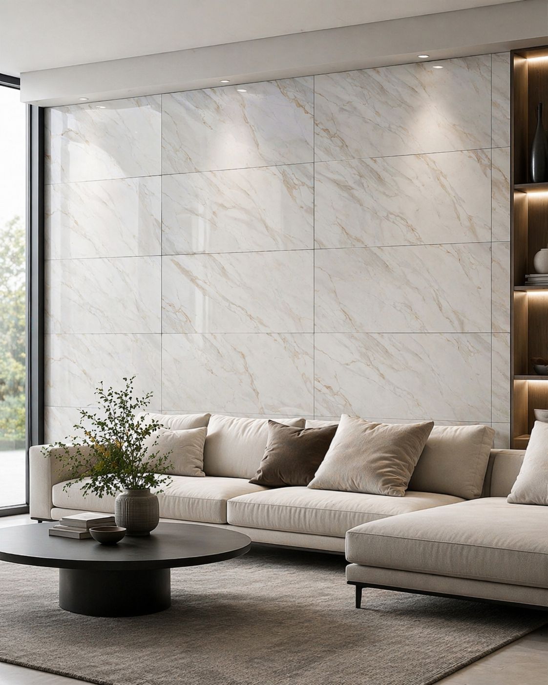 Esta cerámica en formato 30×60 destaca por su elegante diseño tipo mármol, con una base clara en tonos blanco cálido y suaves vetas en gris y beige que aportan movimiento y naturalidad. Su acabado pulido refleja la luz, generando una sensación de amplitud y luminosidad en el espacio.