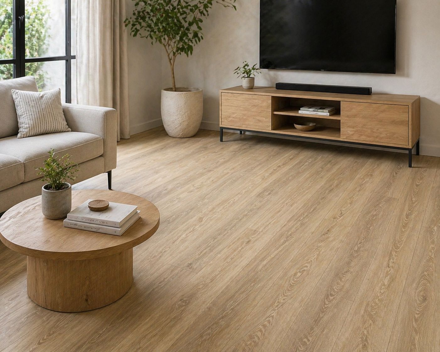 Este piso vinílico presenta un diseño tipo madera en tonos cálidos, con una base beige dorada y matices amarillos suaves que le dan un aspecto natural y acogedor. Su veta está bien marcada, con detalles que imitan nudos y líneas orgánicas propias de la madera real, logrando una apariencia rústica pero elegante.