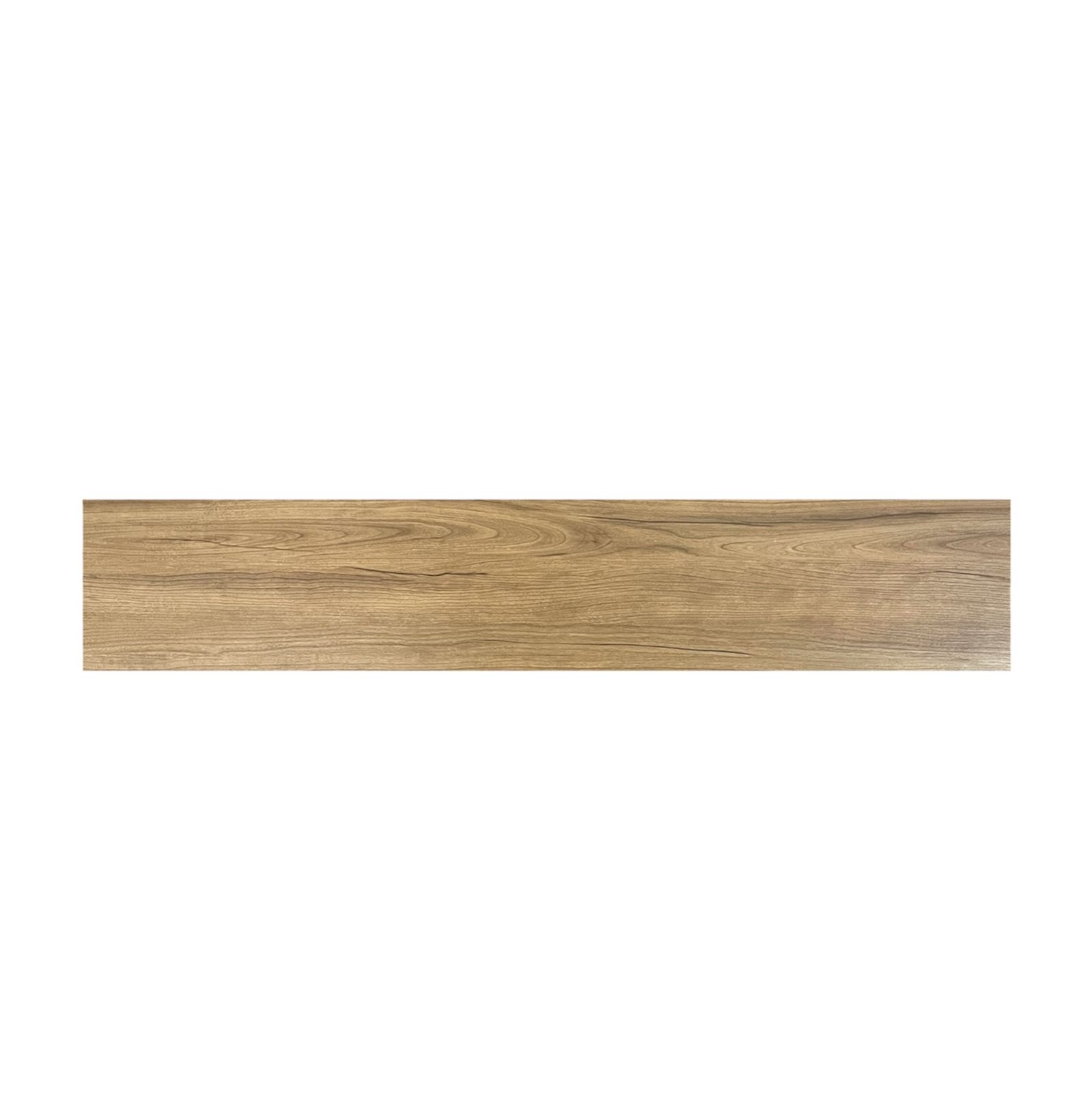 Este porcelanato destaca por su apariencia tipo madera natural en tonos cálidos, logrando un equilibrio perfecto entre elegancia y calidez. Su diseño alargado, con vetas suaves y realistas, imita muy bien la madera de roble, aportando un estilo moderno pero acogedor al espacio.