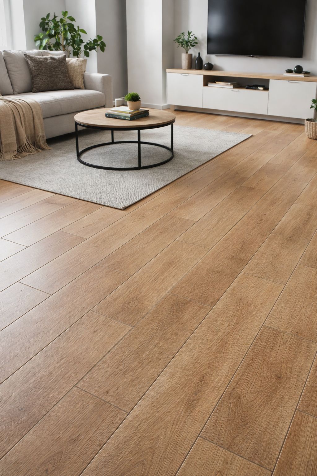La terminación se ve mate-satinada, lo que ayuda a dar una sensación más natural y menos artificial, además de disimular mejor el polvo y las marcas del uso diario. La instalación en formato lineal (tipo tablón) alarga visualmente el ambiente, haciéndolo ver más amplio y ordenado.